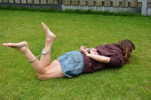A nice sunny day and a girl in a dark red hoodie an a jeans skirt. What dowe need more to made some nice handcuff pictures. Sigrun is posing for us barefoot in this outfit. We cuffed her up with some sets of handcuffs from the American Handcuff Company (AHC) and we put her in several positions.