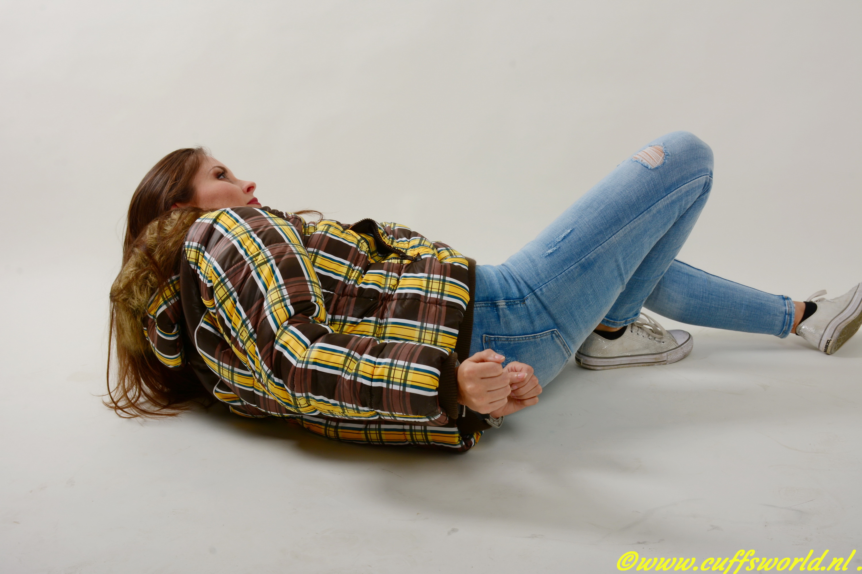 An indoorshoot with our model Tanya, she is dressed in a winter outfit, a lght shiny winterjacket, jeans and sneakers. Our SHN handcuffs are brandnew when we have this shoot, that is why it looks like we used them very often. They are very great cuffs and since a short time used by Dutch police forces.