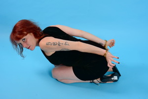 Golden handcuffs for our model Raven. This nice set of golden peerless handcuffs