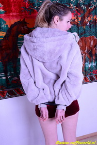 Our blond model Chisty was dressed in a red jumpsuit and a fake fur jacket